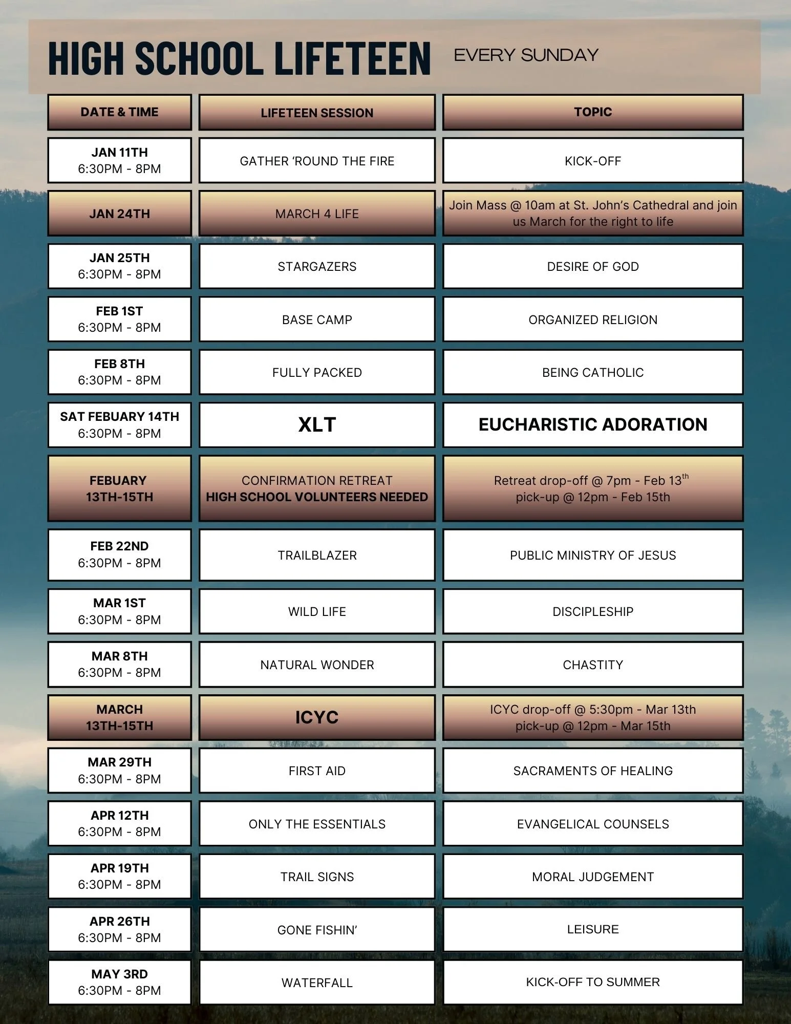 Through the Life Teen model, your teen will experience faith in a dynamic, engaging, and relational way—through community, worship, service, and a deeper understanding of the Catholic faith!